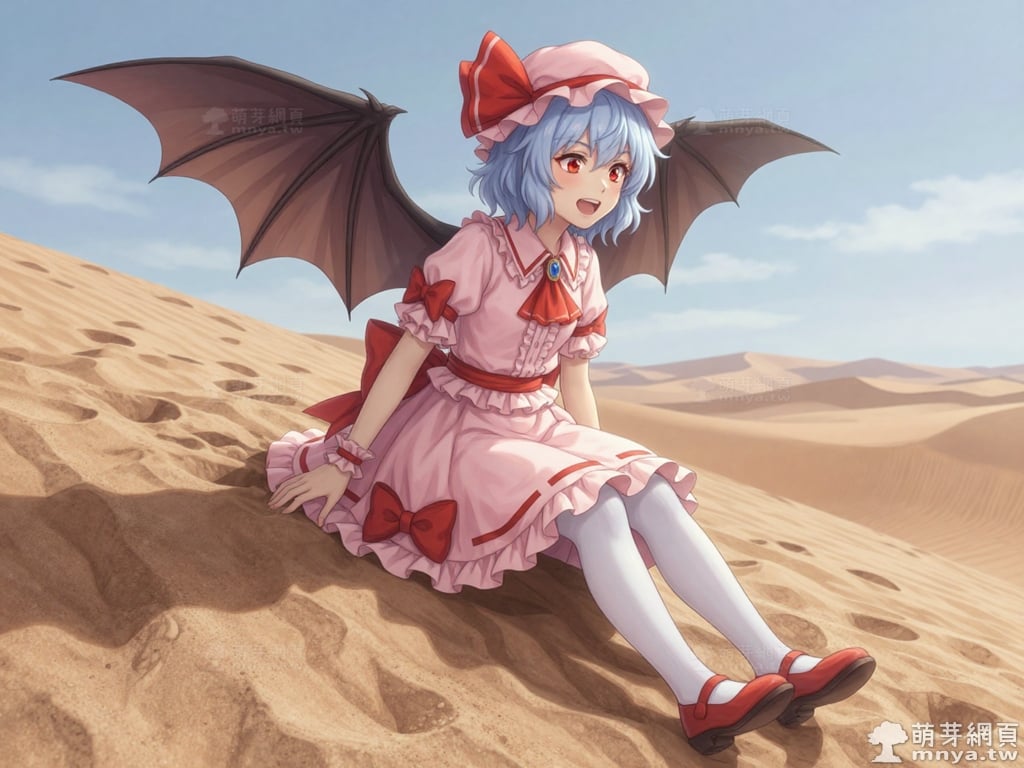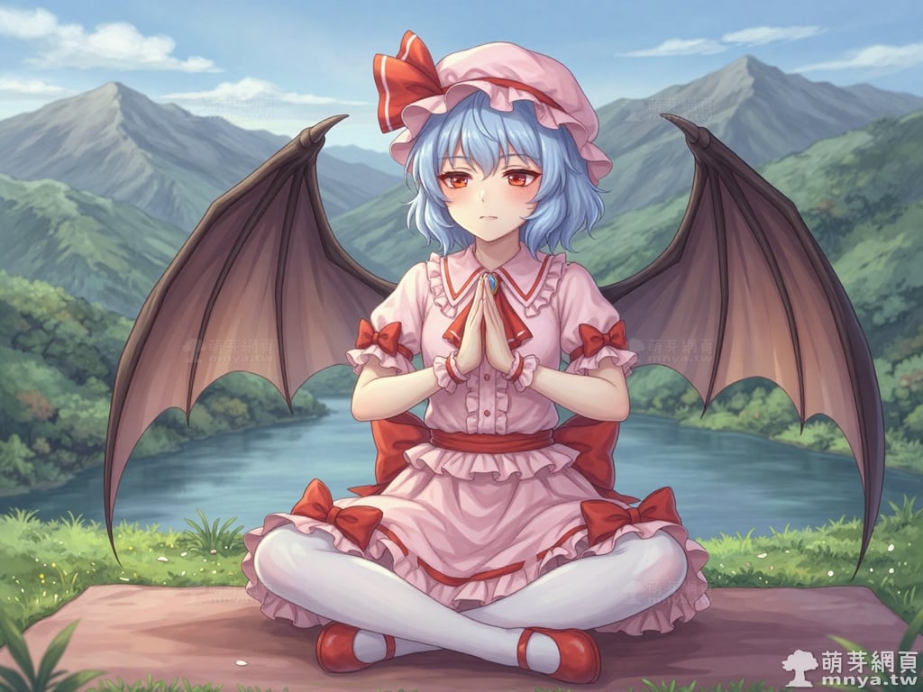 提詞文字:masterpiece, high quality, anime, (remilia_scarlet_z:2), blue hair, short hair, hair between eyes, red eyes, mob cap, pink headwear, red hat ribbon, bat wings, wings, pink dress, frilled dress, collared dress, red ascot, brooch, puffy short sleeves, wrist cuffs, frills, frilled skirt, multiple red bows on skirt, back bow, white tights, red shoes, mary janes, large red bow tied at the back of the waist, blue gem brooch on the ascot, __1000prompts__. <lora:remilia_scarlet_z_000001800>