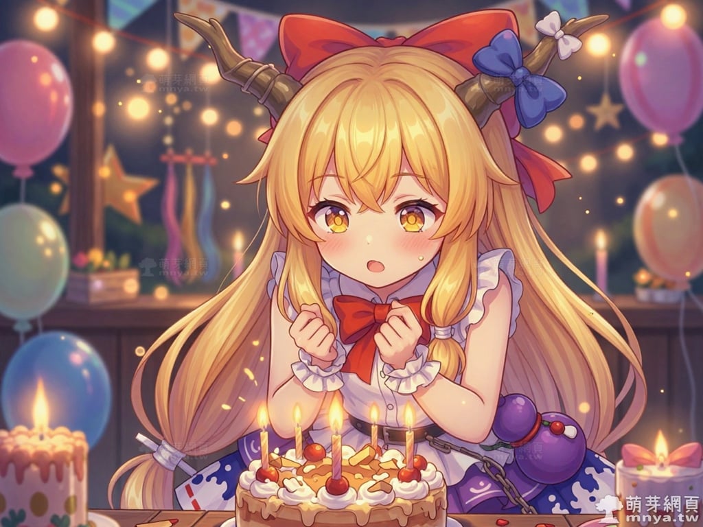 提詞文字:masterpiece, high quality, anime, (ibuki_suika_z:2), orange hair, very long hair, low-tied long hair, orange eyes, bangs, sidelocks, oni horns, sleeveless white shirt, frilled shirt, red bowtie, layered skirt, purple skirt, white socks, black shoes, footwear bow, waist accessory, chain, the character has a bundled right-side sidelock and a large red bow on the back of her head; her right horn is decorated with a blue bow and a small white bow near the tip, while the left horn is wrapped with white ribbon; a two-tiered skirt where the top purple layer features white crescent patterns and the bottom white layer features blue scalloped wave patterns with red dashed line details; around her waist she wears a belt with metallic luster rings, a purple gourd hanging, __1000prompts__. <lora:ibuki_suika_z_000001800>