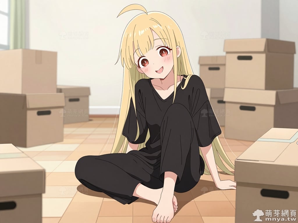 提詞文字:masterpiece, high quality, anime, (kaguya_z:2), blonde hair, red eyes, blunt bangs, hair between eyes, single ahoge, black t-shirt, oversized shirt, the straight hair extends remarkably long down to the lower back. the loose-fitting garment is worn as a minimalist one-piece dress that drapes baggily over the frame, __1000promptspro__. <lora:kaguya_z_000001800>