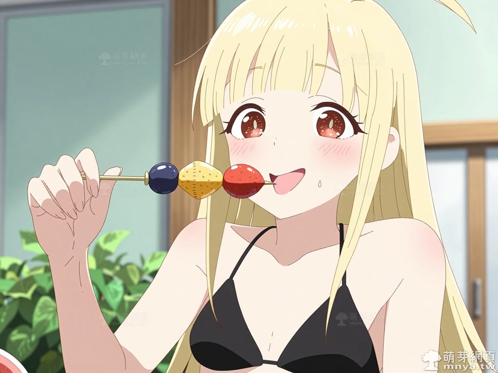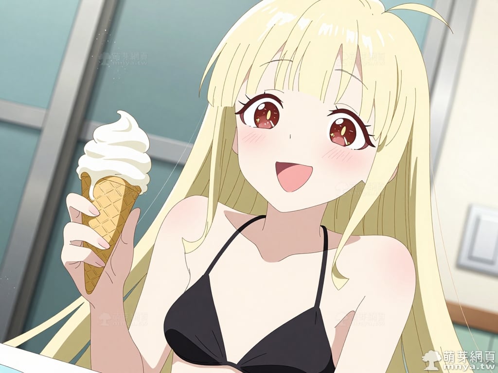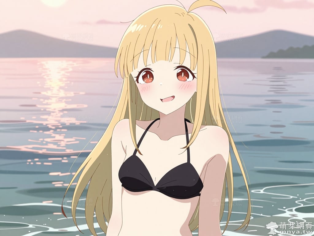 提詞文字:masterpiece, high quality, anime, (kaguya_z:2), blonde hair, red eyes, blunt bangs, hair between eyes, single ahoge, (extremely simple black bikini:2), (showing bare skin everywhere else), (collarbone), (bare shoulders), (naked), __1000promptsbikini__. <lora:kaguya_z_000001800>