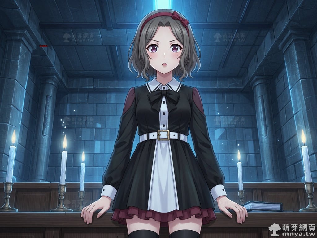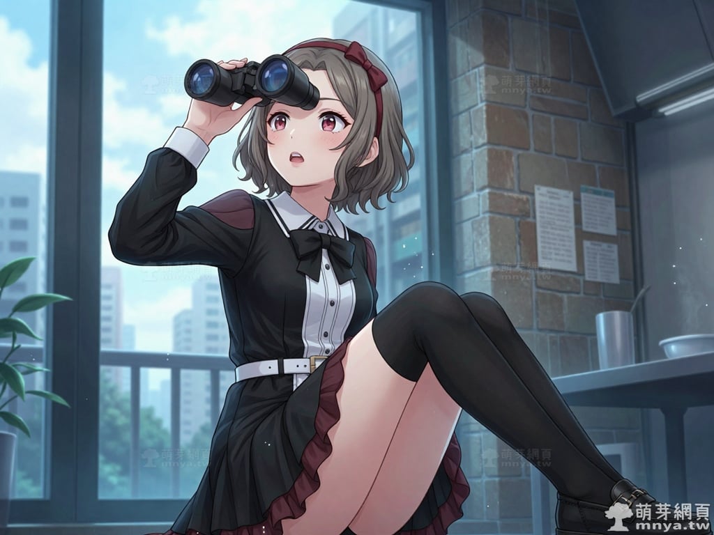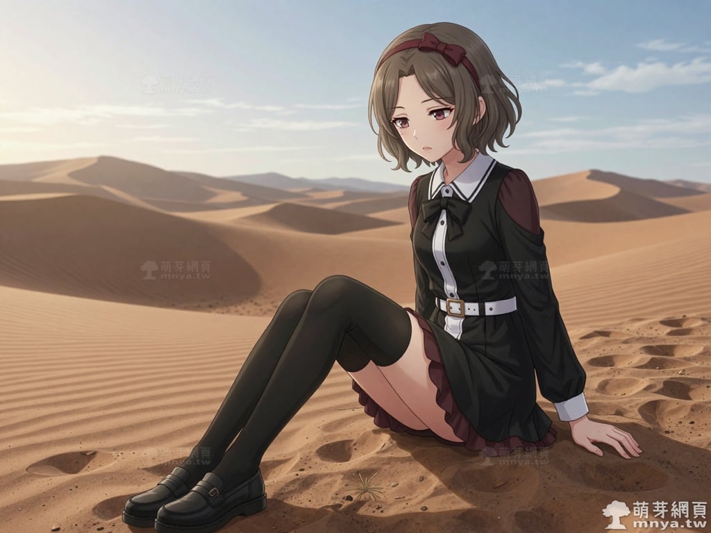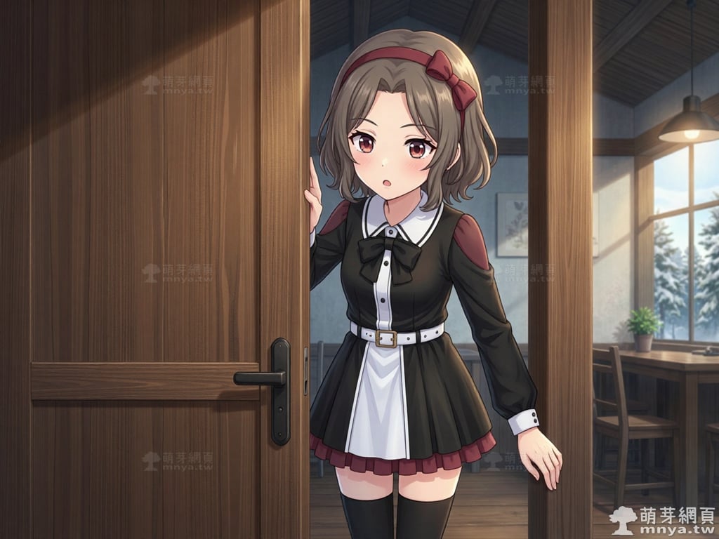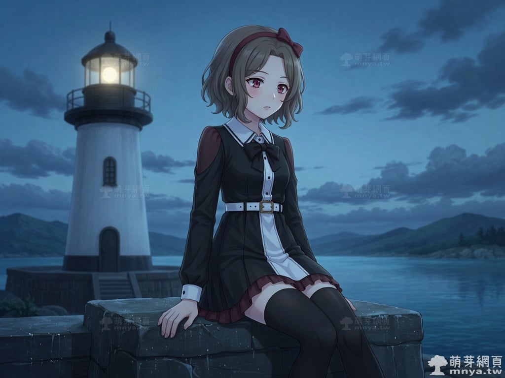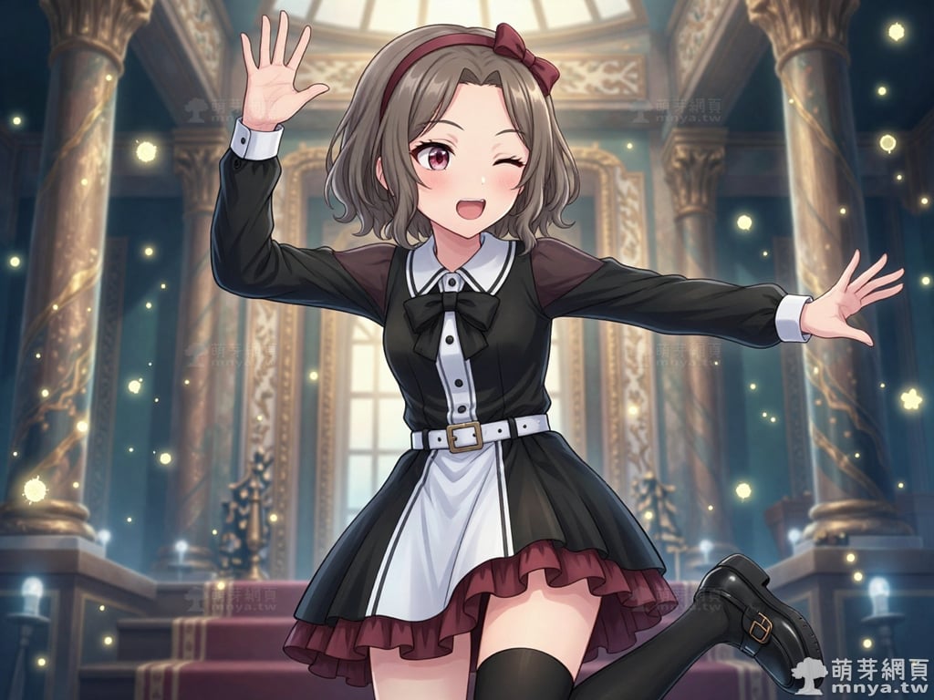 提詞文字:masterpiece, high quality, anime, (ebizuka_tomo_z:2), short wavy brown hair, parted bangs, red eyes, red hairband with a right side red bow, black long-sleeved collared dress, short dress, white collar, white cuffs, upper sleeves feature semi-transparent maroon mesh panels just below the shoulders, white button-up front panel with black buttons, black bowtie, white belt, gold buckle, maroon frilled ruffle at the hem, zettai ryouiki, black thighhighs, black platform loafers with chunky soles, __1000prompts__. <lora:ebizuka_tomo_z_000001800>