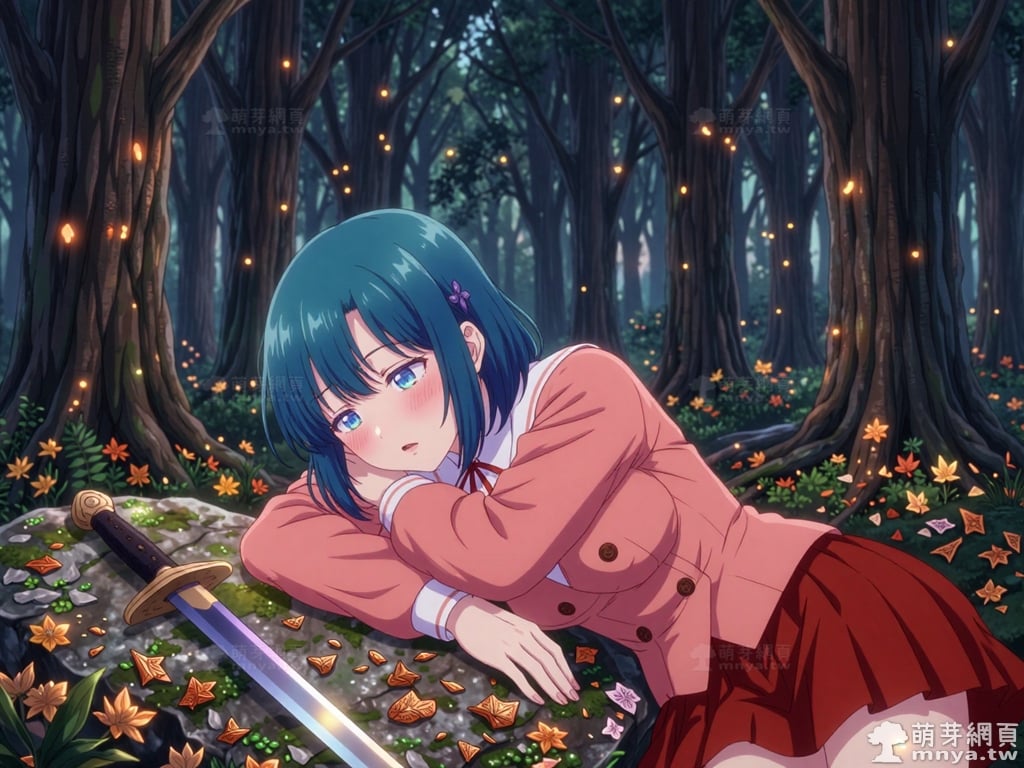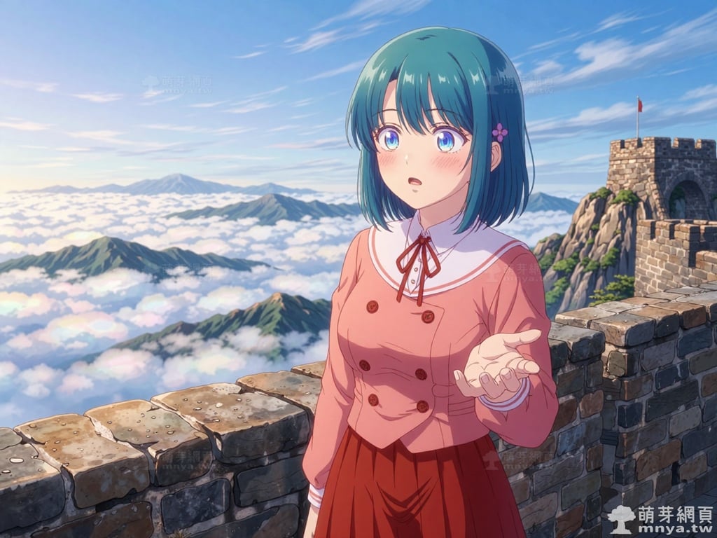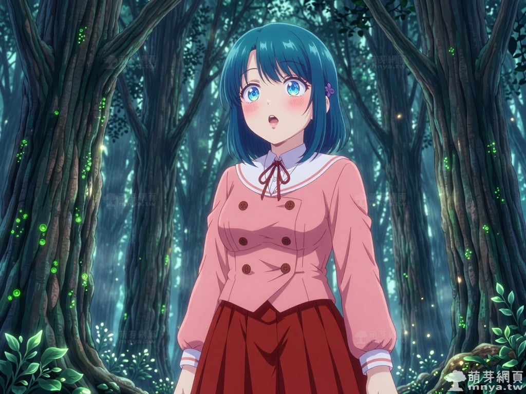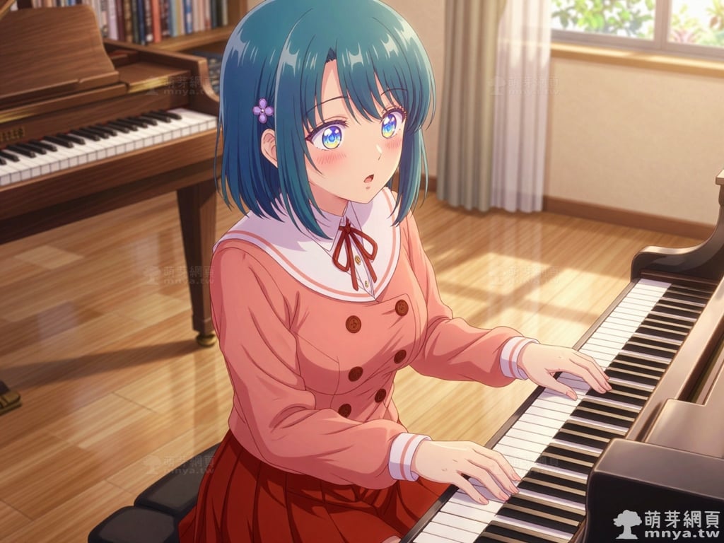 提詞文字:masterpiece, high quality, anime, (minamo_shio_z:2), short hair, bob cut, bangs, blue hair, deep cyan hair, blue eyes. small, four-petaled purple flower hair ornaments are secured on both the left and right sides of her hair. she wears a precise layered outfit, starting with a structured, double-breasted salmon-pink jacket with four distinct brown buttons. this is worn over a crisp white collared shirt with a tidy red ribbon bowtie. below the jacket is a maroon pleated mini skirt, __1000promptspro__. <lora:minamo_shio_z_000001800>