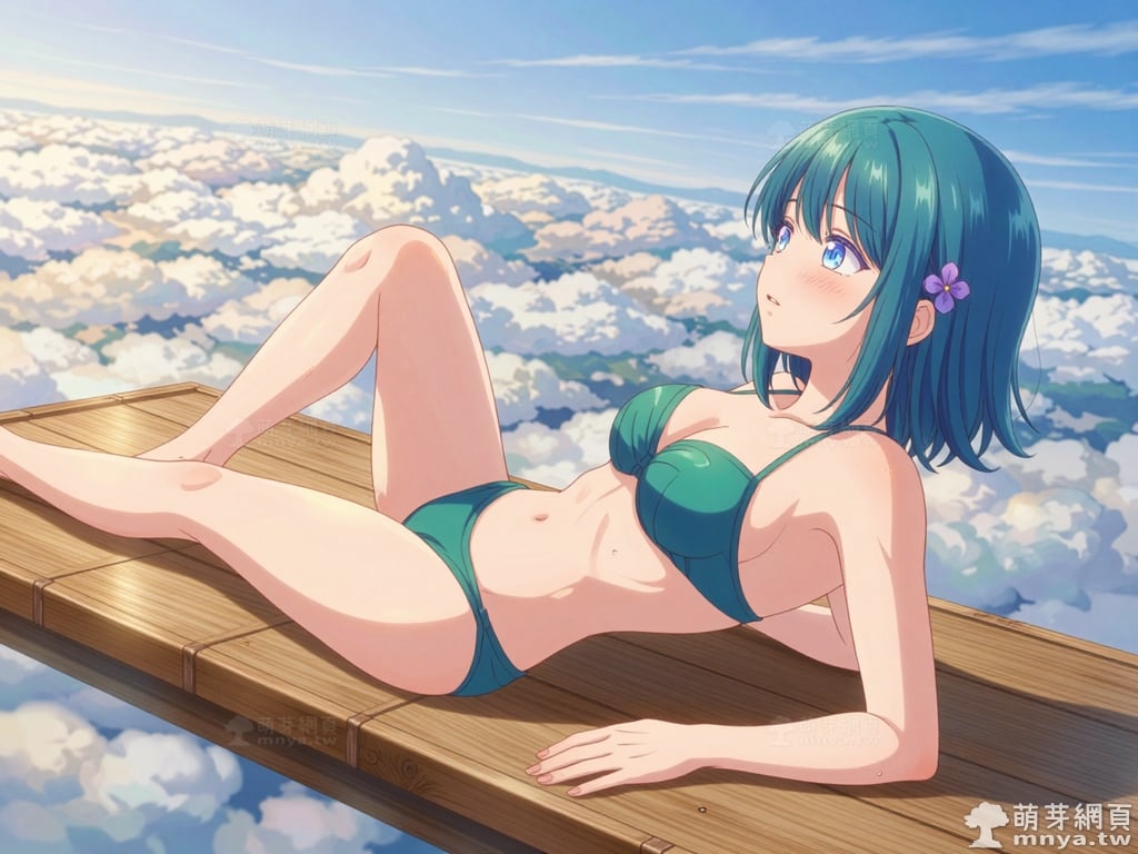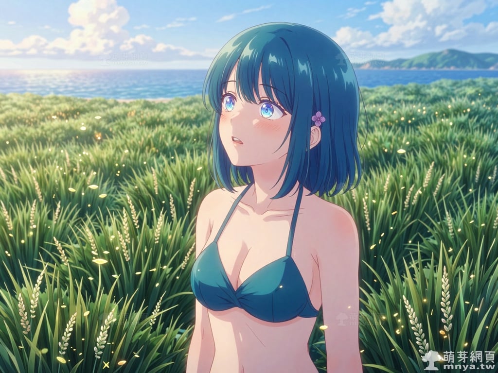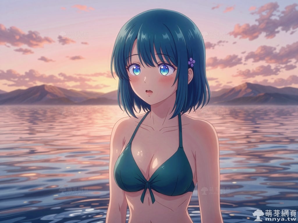 提詞文字:masterpiece, high quality, anime, (minamo_shio_z:2), short hair, bob cut, bangs, blue hair, deep cyan hair, blue eyes. small, four-petaled purple flower hair ornaments are secured on both the left and right sides of her hair, (extremely simple deep cyan bikini:2), (showing bare skin everywhere else), (collarbone), (bare shoulders), (naked), __1000promptsbikini__. <lora:minamo_shio_z_000001800>