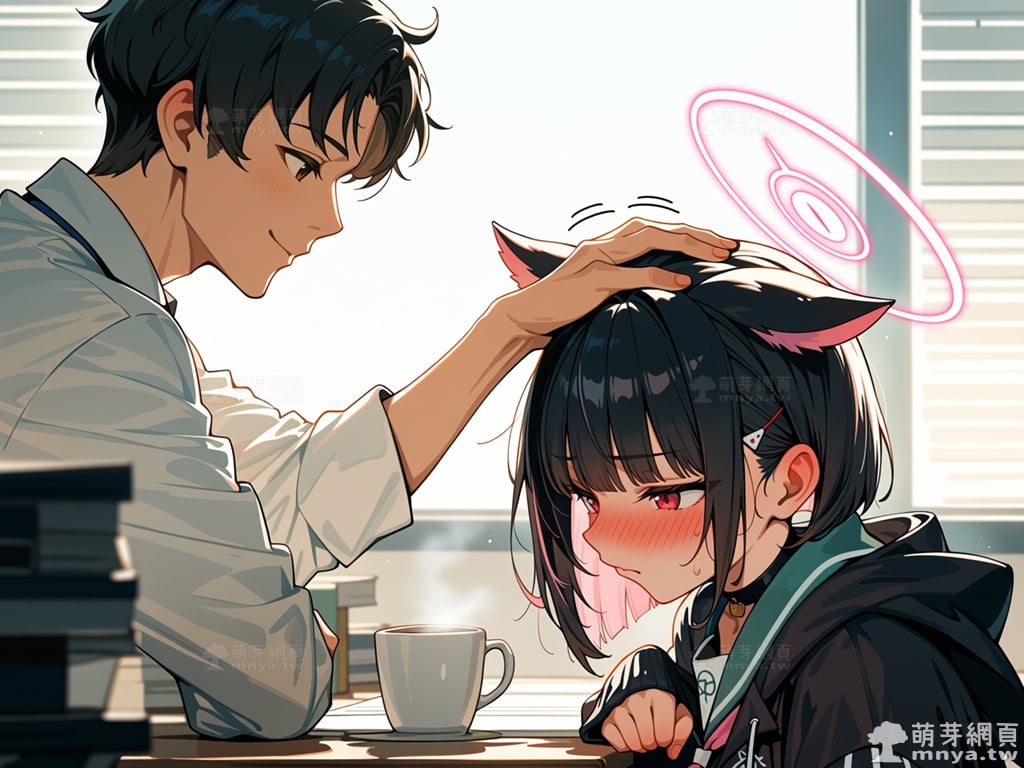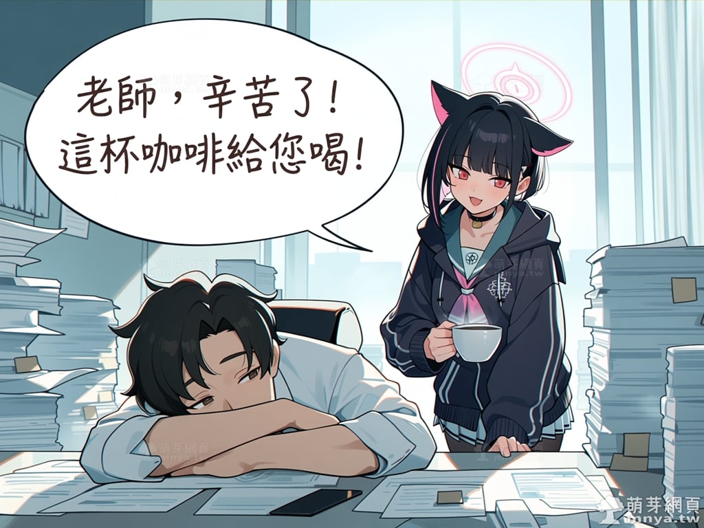 在堆滿公文、燈光昏暗的夏萊辦公室裡,工作到精疲力竭的老師正趴在桌上小憩,試圖找回一點專注力。這時,放學後的杏山千紗悄悄現身,她收起平時那副酷酷的表情,體貼地遞上一杯熱騰騰的咖啡,輕聲說道:「老師,辛苦了!這杯咖啡給您喝!」這份突如其來的關懷讓老師感到一陣暖意,看著眼前這位平時傲嬌卻又無比溫柔的少女,老師忍不住伸手摸了摸她的頭表示感謝。千紗瞬間臉紅到了耳根子,原本冷靜的眼神變得羞澀閃躲,貓耳與光環似乎也隨著加速的心跳微微顫動。短暫的甜蜜互動後,千紗帶著一絲難為情與滿足的笑容,揮手向老師道別。雖然只是一杯簡單的咖啡與一次摸頭,但這份來自「甜點貓」的專屬心意,已讓辦公室原本沉悶的空氣瞬間充滿了幸福的餘韻,也為老師注入了繼續努力的動力。