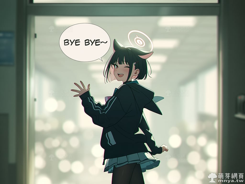 newest, score_9, score_8, masterpiece, best quality, highres, year 2024, safe, 1girl, kazusa (blue archive), blue archive, blue archive the animation, halo, cat ears, animal ears, two-tone hair, short hair, black hair, pink hair, pink halo, blush, red eyes, black jacket, pleated skirt, skirt, long sleeves, sailor collar, Kazusa stands at the threshold of the open office door, her body half-turned as she looks back over her shoulder towards the unseen Sensei with a joyful, radiant smile and deep crimson blush spreading across her cheeks. Her distinct black and pink two-tone hair slightly swings, and her shimmering pink halo floats clearly above her head as she happily waves one hand in farewell. The entire surrounding background, including the office doorway and the hallway beyond, is heavily blurred into a soft, hazy bokeh of light and indistinct shapes, drawing all focus onto her. A single white dialogue bubble floats near her smiling mouth, containing the cheerful, handwritten-style text: BYE BYE~, rendered in the crisp, clean official Blue Archive animation art style with soft cell-shading.