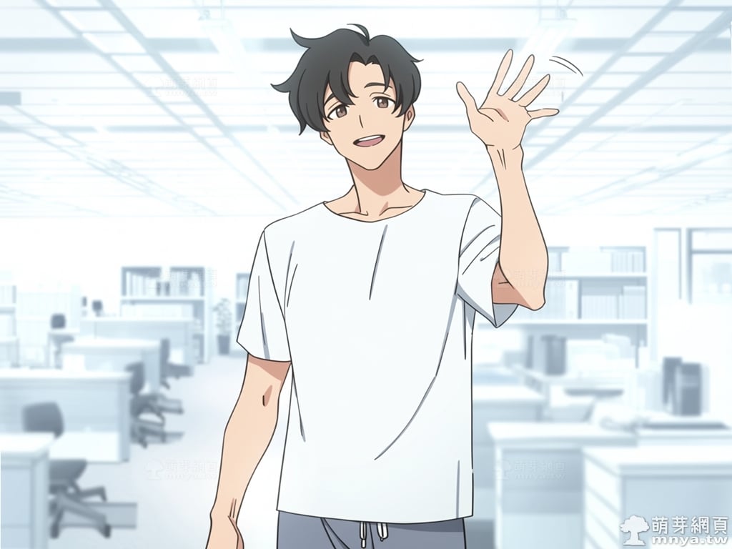 newest, score_9, score_8, masterpiece, best quality, highres, year 2024, safe, 1boy, sensei (blue archive the animation), blue archive, blue archive the animation, Sensei, a man with short, messy black hair that partially falls between his brown eyes, stands casually within a brightly lit, modern office environment. He is wearing a simple white short-sleeved t-shirt that reveals his collarbone, paired with grey shorts, and is smiling warmly as he raises his right hand to wave enthusiastically towards the camera. The background is a heavily blurred depth-of-field shot of a white office workspace, showing indistinct shapes of desks, shelves, and office equipment under bright, even lighting.