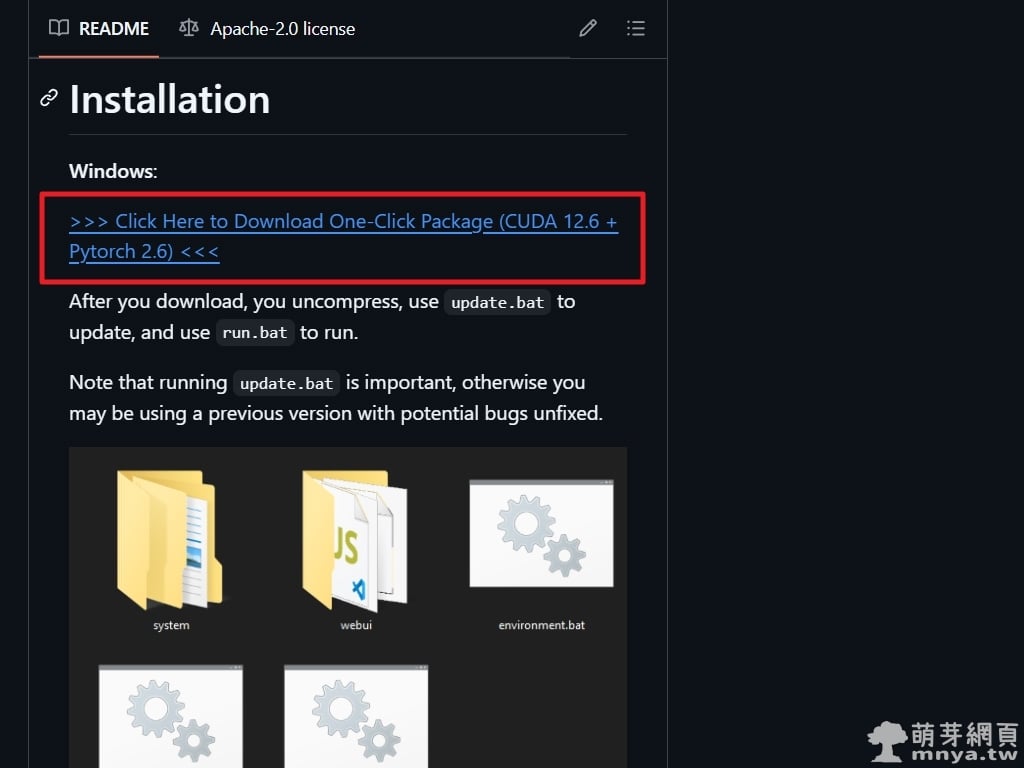 ▲ 從 FramePack 的 GitHub 頁面開始,點擊「>>> Click Here to Download One-Click Package (CUDA 12.6 + Pytorch 2.6) <<<」下載 CUDA 12.6 與 PyTorch 2.6 整合包,檔案解壓後即可看到相關資料夾與執行檔,準備進入下一步安裝流程。