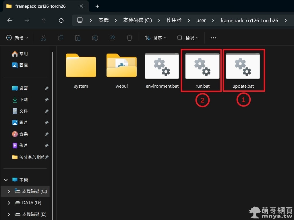 ▲ 解壓後的資料夾內含 system、webui,首先執行 update.bat(標記 1)更新程式,確保版本最新,接著雙擊 run.bat(標記 2)啟動圖形化介面。