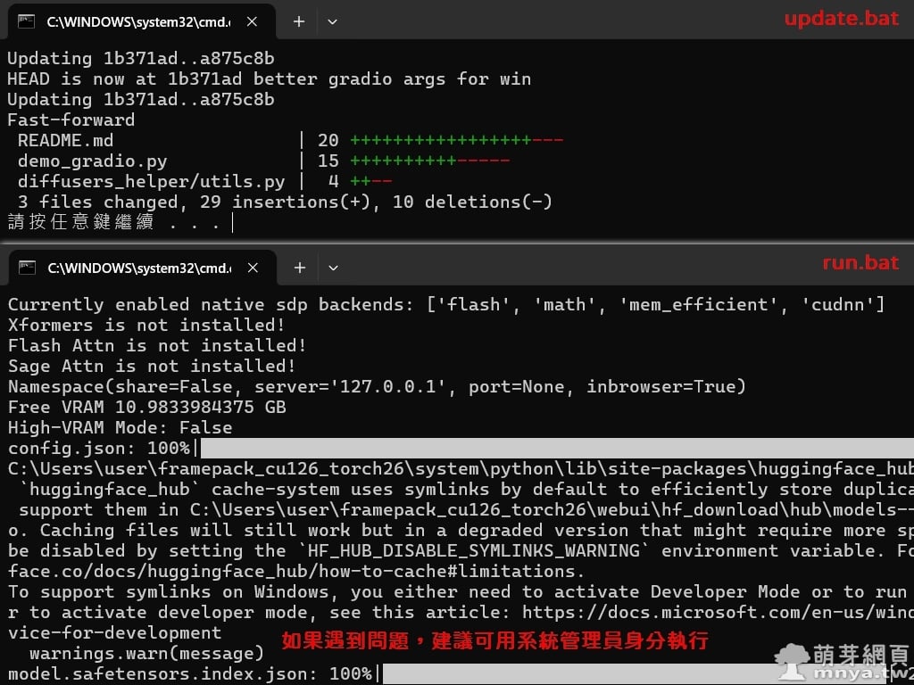 ▲ 執行 update.bat 確保程式更新,顯示版本號與檔案變更訊息;執行 run.bat 時,若遇到問題,建議可用系統管理員身分執行。執行 run.bat 後,終端機會顯示模型與資源下載進度,初次啟動會自動從 HuggingFace 下載超過 30 GB 檔案。
