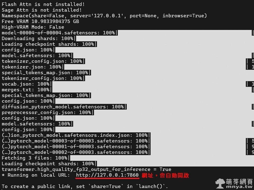 ▲ 完成下載後將顯示本地 URL http://127.0.0.1:7860,介面也會自動啟動。