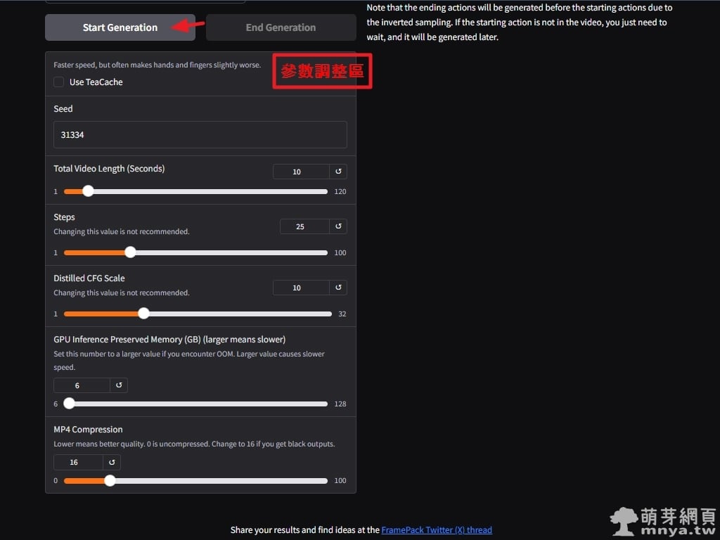 ▲ 調整參數如總影片長度設為 10 秒,建議保持預設的 Steps(25)、Distilled CFG Scale(10),並將 GPU 記憶體保留設為 6 GB,點擊「Start Generation」開始生成。TeaCache 是 FramePack 提供的一種加速生成技術,透過預先快取部分計算結果來提升影片生成的效率,但並非完全無損,可能影響最終畫質;開發者建議先用 TeaCache 測試創意,再以完整擴散流程生成高品質成果。