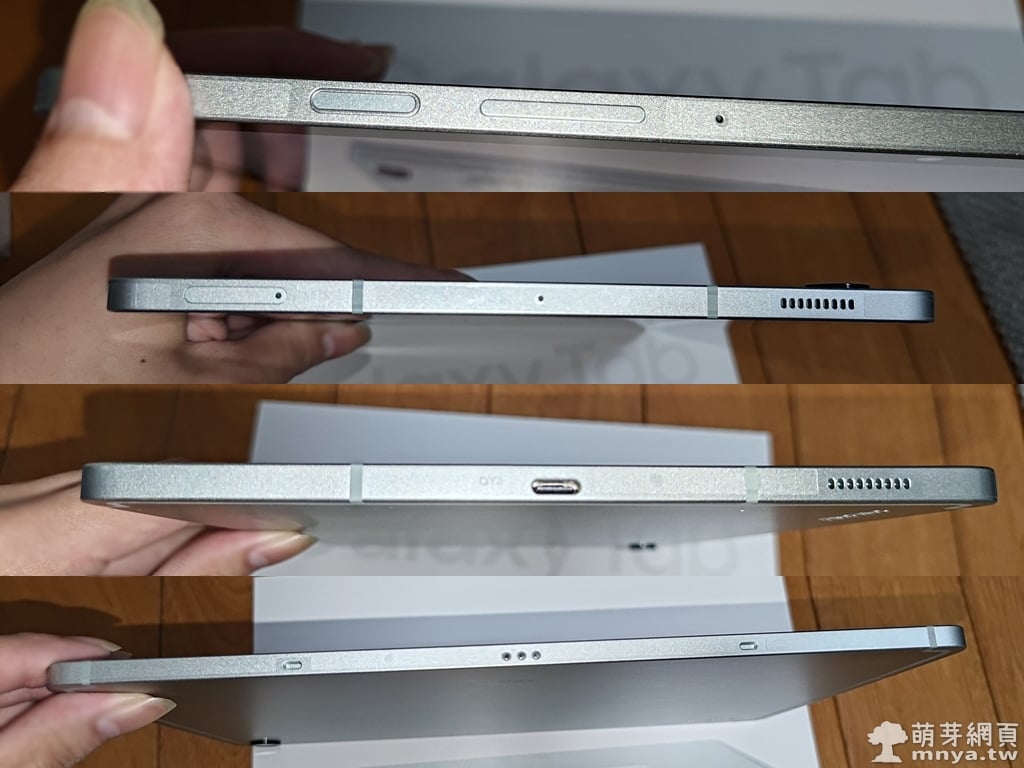 ▲ 平板機身四周配置豐富,包含電源鍵、音量鍵、喇叭孔、USB-C 孔與 microSD 卡槽位置。