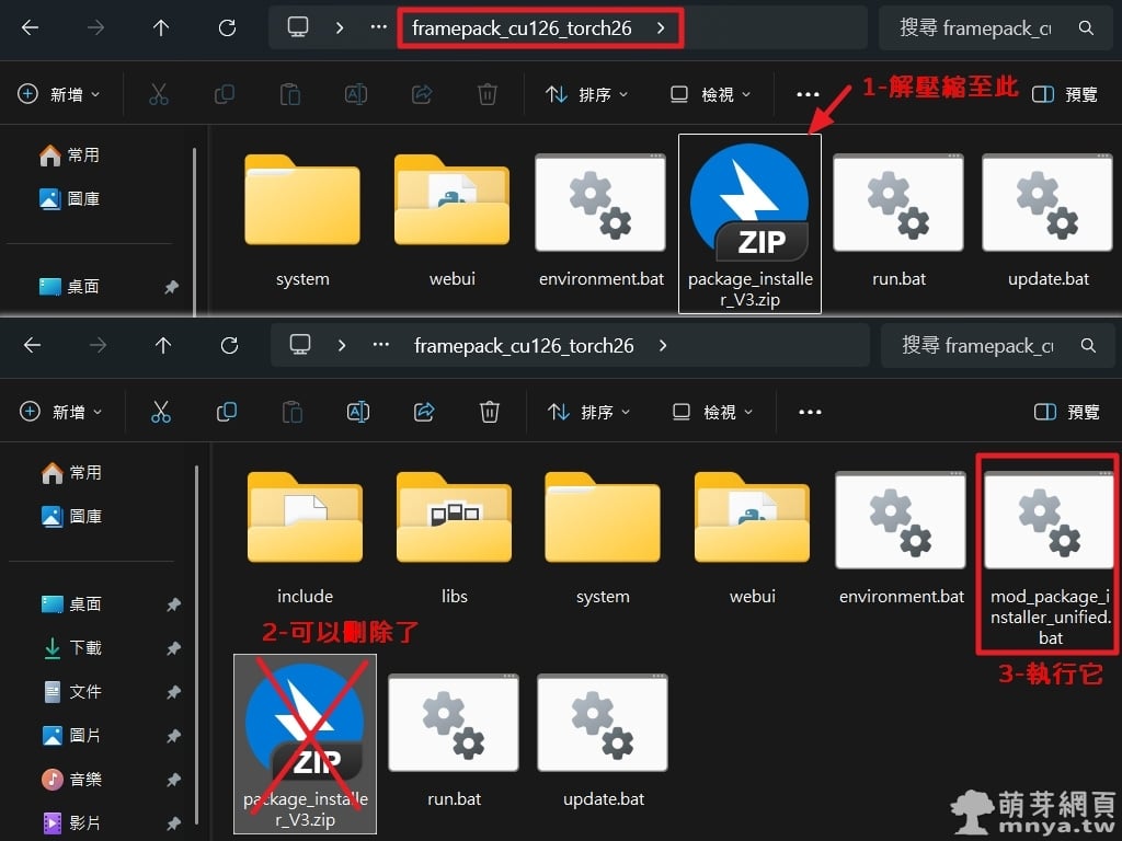 ▲ 下載 package_installer_V3.zip 後,請將壓縮檔放到 FramePack 主目錄,與 run.bat、update.bat 同層。