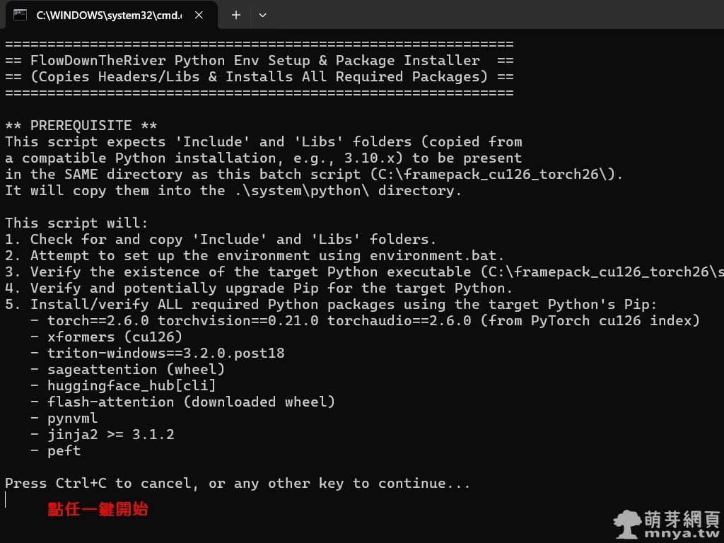 ▲ 終端機會顯示安裝前確認訊息與安裝模組清單,包含 SageAttention、FlashAttention、xformers 等重要加速模組。