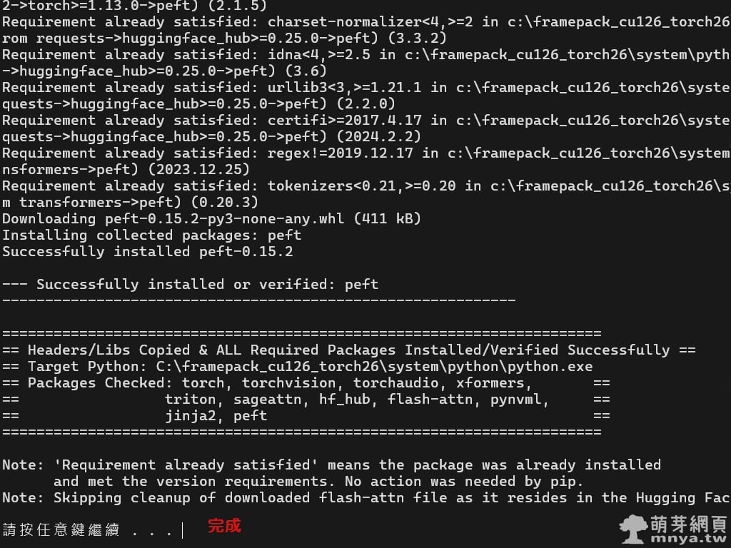 ▲ 安裝完成後會顯示「請按任意鍵繼續」字樣,代表所有必要套件均已安裝成功。