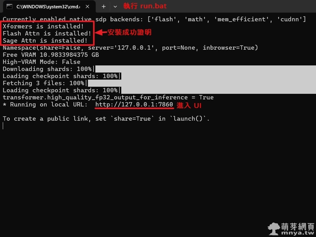 ▲ 執行 run.bat 後可在終端機看到加速模組載入成功的提示,包括「Sage Attn is installed!」的字樣。