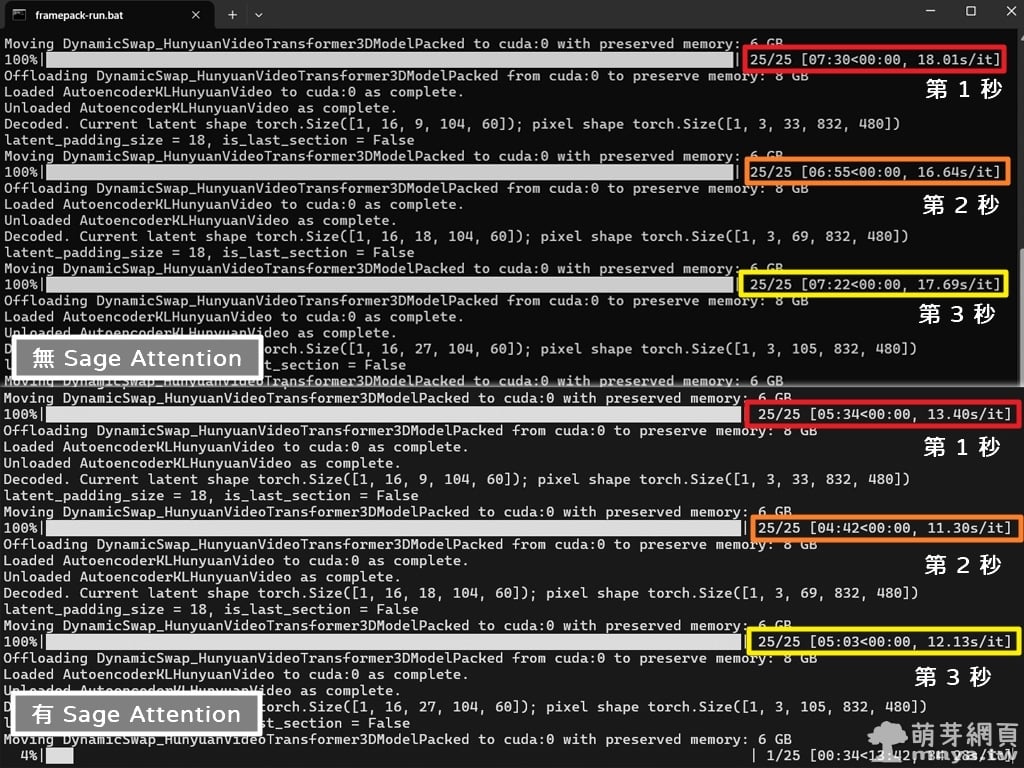 ▲ 實測前三秒生成時間差異:啟用 Sage Attention 每秒平均快約 26%,大幅縮短影片生成等待時間!(兩次皆有啟用 TeaCache)