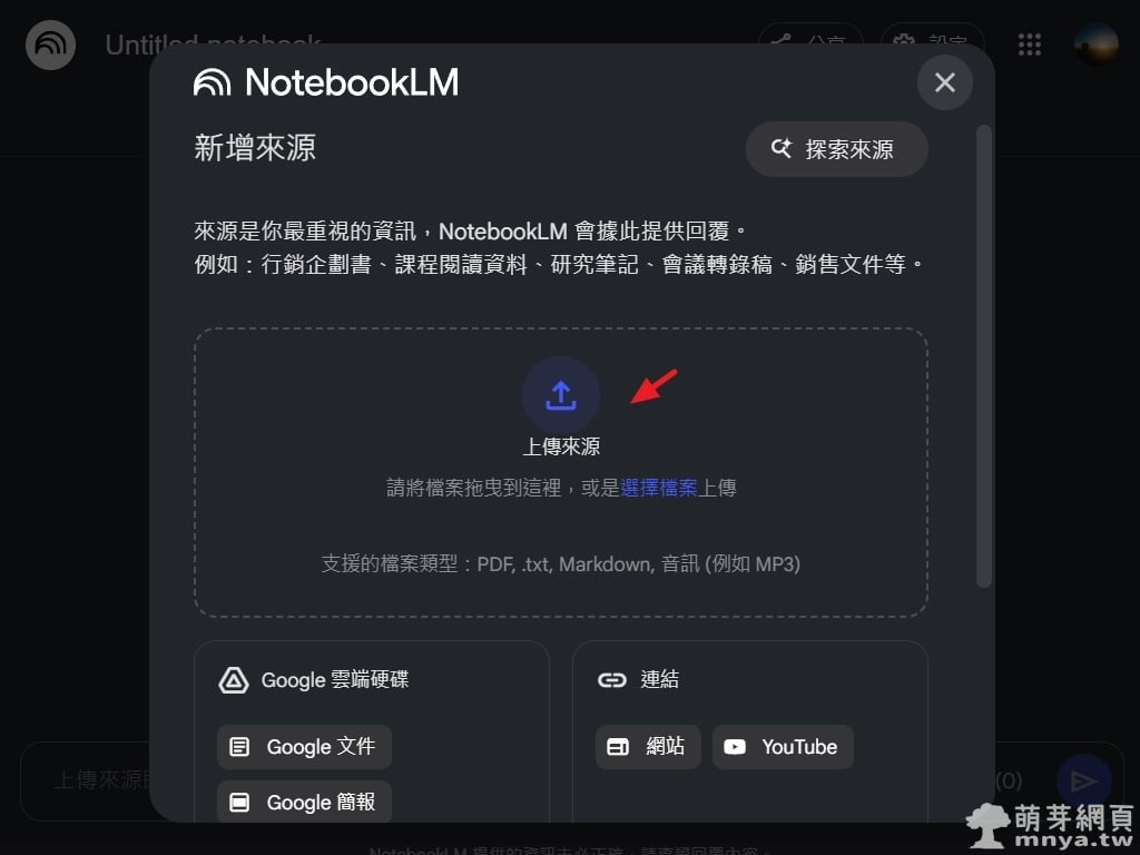 ▲ 接著會出現「新增來源」的畫面,可選擇上傳本機檔案(例如 PDF、TXT、MP3 等格式),也能連結 Google 文件、雲端硬碟、YouTube 或網頁等外部來源。這些來源會成為 NotebookLM 回答問題與生成摘要的參考資料。