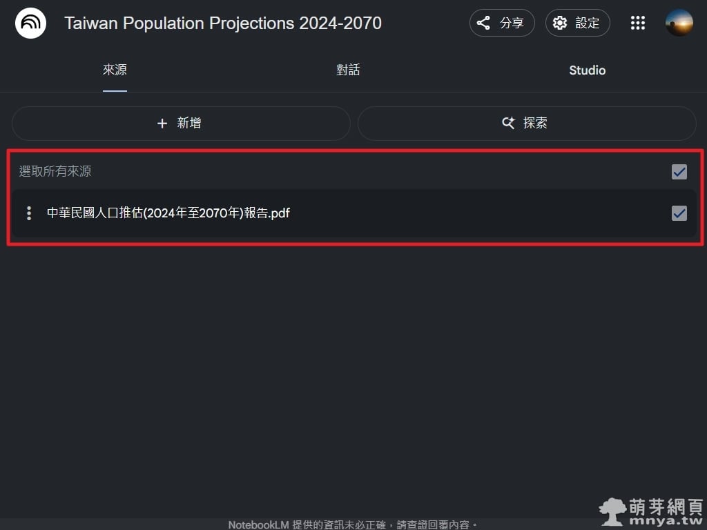 ▲ 資料上傳成功後,會出現在筆記本的來源清單中。在這裡可以勾選要啟用的來源檔案,例如這張圖示範上傳了一份「中華民國人口推估(2024 年至 2070 年)報告」(資料來源:國發會),作為後續分析與對話的基礎資料。