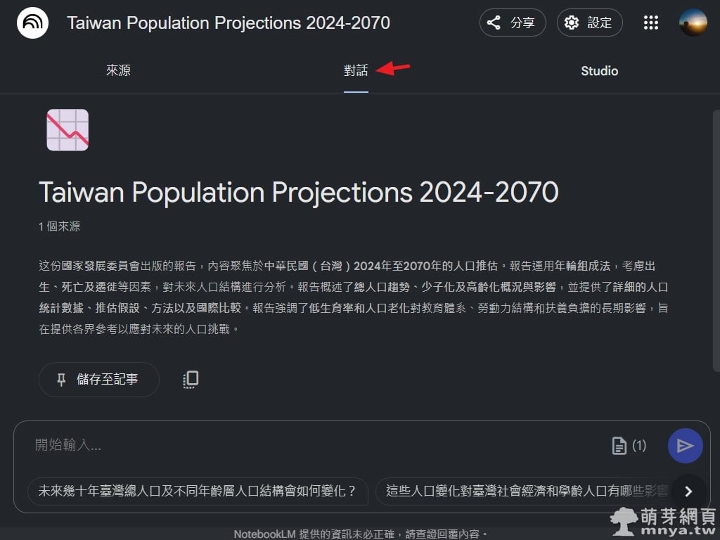 ▲ 切換至「對話」頁籤,就能開始與 NotebookLM 對話。系統會根據上傳的資料內容,理解並回答使用者的提問,像是一份研究摘要的 AI 助理,能快速針對複雜報告進行解釋與延伸討論。