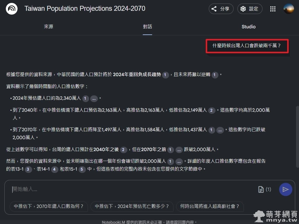▲ 使用者可以針對特定問題提問,例如「什麼時候台灣人口會跌破兩千萬?」NotebookLM 會根據報告中的統計數據與預測資訊提供完整答案,還會自動引用來源中的數字與段落,提升解釋的準確性。