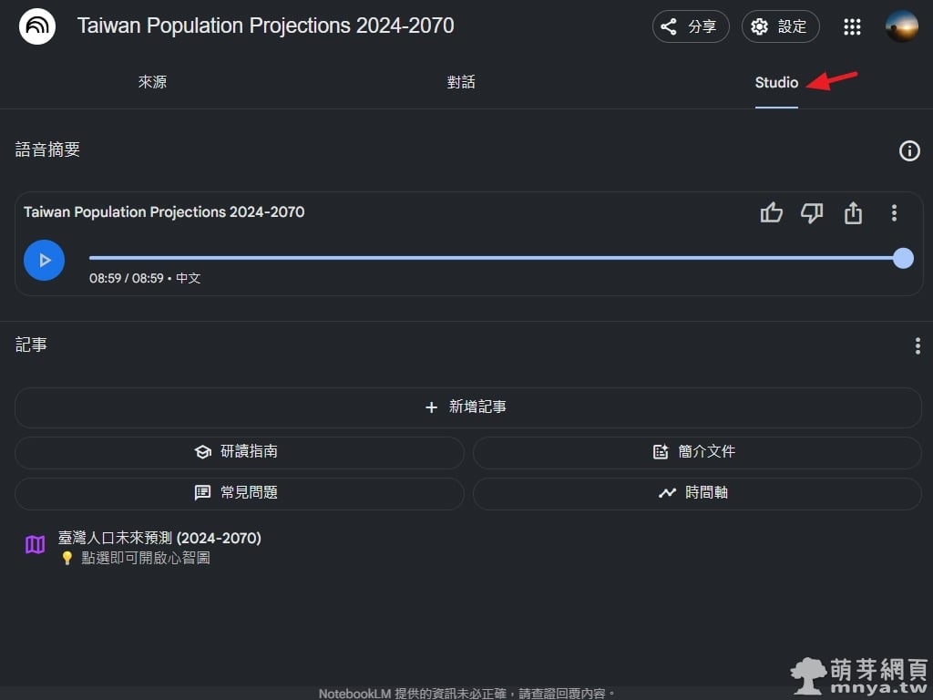 ▲ 最後切換至「Studio」頁籤,就能看到自動生成的語音摘要。NotebookLM 會根據文件內容整理出一段可播放的音訊內容,支援中文語音播放,讓使用者能以 Podcast 的方式吸收文件重點,非常適合通勤或休息時間收聽,這個 Podcast 可以下載為 .wav 音訊檔案。範例如下: