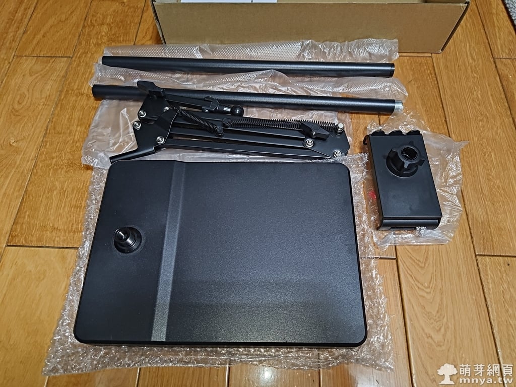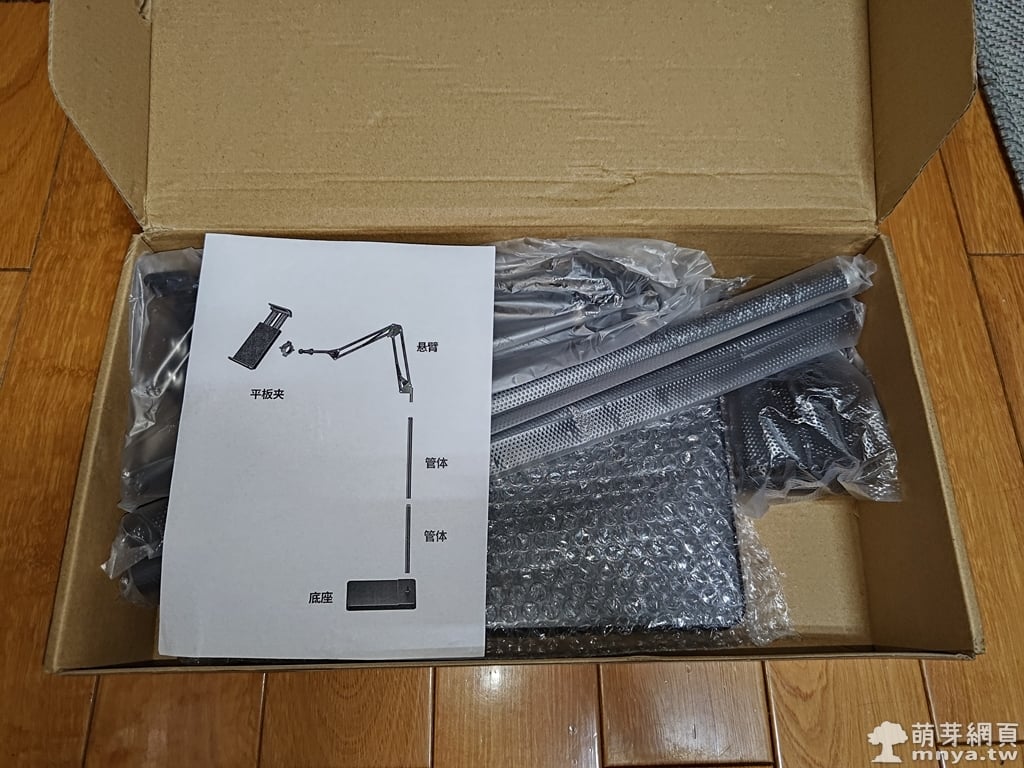 ▲ 所有零件一字排開,包含懸臂、管體、底座與雙拉夾頭,包裝防護到位,零件完好無損。