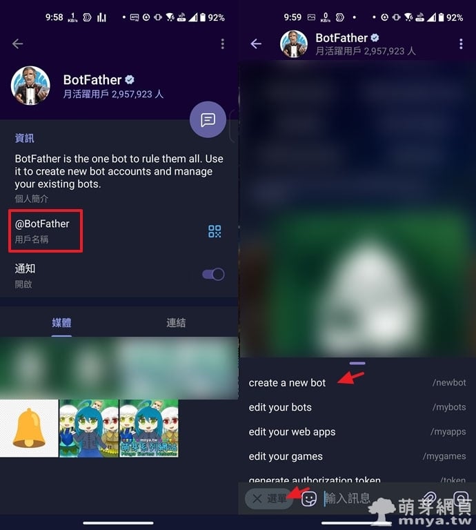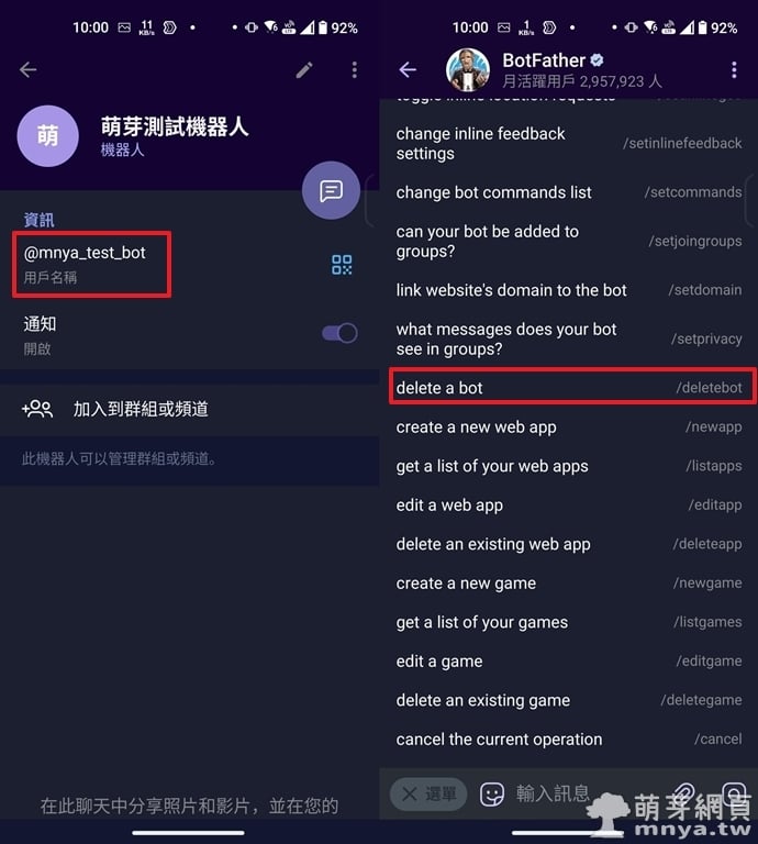 ▲ 左:可在 Bot 資訊頁中看到使用者名稱,如 @mnya_test_bot。/右:若日後不再需要此機器人,BotFather 提供 /deletebot 指令來刪除機器人。