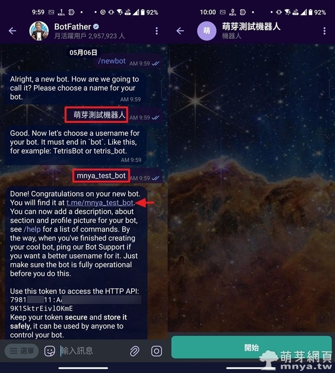 ▲ 左:輸入你想為機器人命名的顯示名稱,例如「萌芽測試機器人」。再來輸入使用者名稱,必須以 bot 結尾,完成後會收到 bot 的連結與 Token。/右:點進去看看建立好的機器人,現在還沒有任何功能。