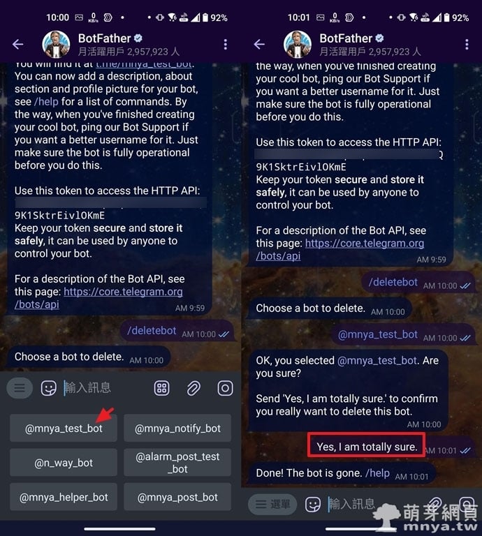 ▲ 左:選擇要刪除的機器人帳號,例如 @mnya_test_bot。/右:輸入「Yes, I am totally sure.」以確認刪除,機器人即會被移除。
