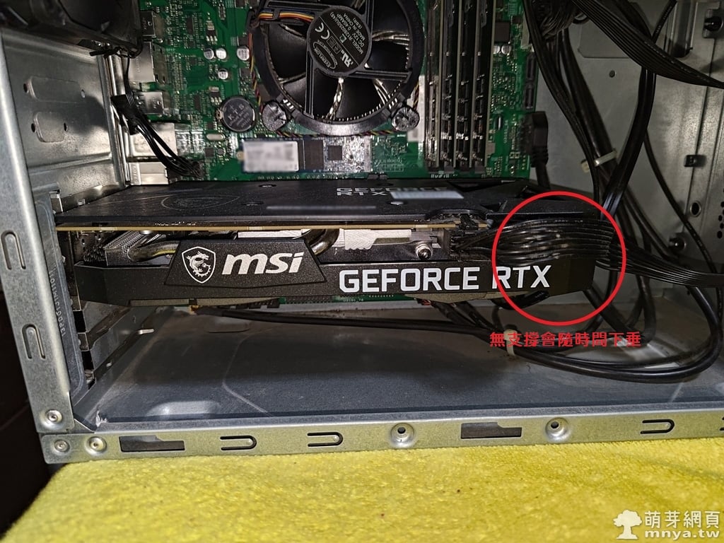 ▲ 顯示卡尾端開始下垂,雖然還沒到嚴重彎曲,但已經明顯與主機板不平行,長期下來恐有風險。