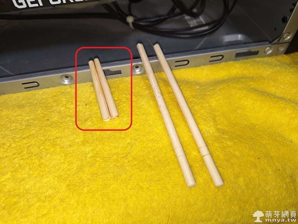 ▲ 準備了一雙竹筷,其中短一點的是鋸過後的成品,打算用來撐住顯示卡尾端避免持續下墜。
