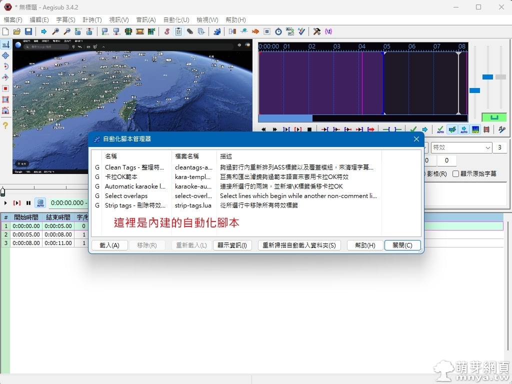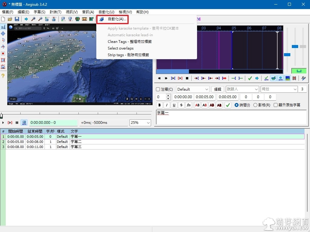 ▲ 在 Aegisub 中打開影片與字幕檔後,點選上方選單「自動化」→「自動化(A)...」,進入自動化腳本管理介面。