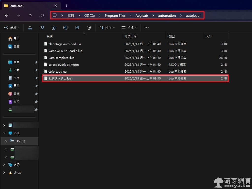 ▲ 將編寫好的「批次淡入淡出.lua」腳本放入 Aegisub 的 C:\Program Files (x86)\Aegisub\automation\autoload 資料夾中,即可在程式開啟時自動載入。