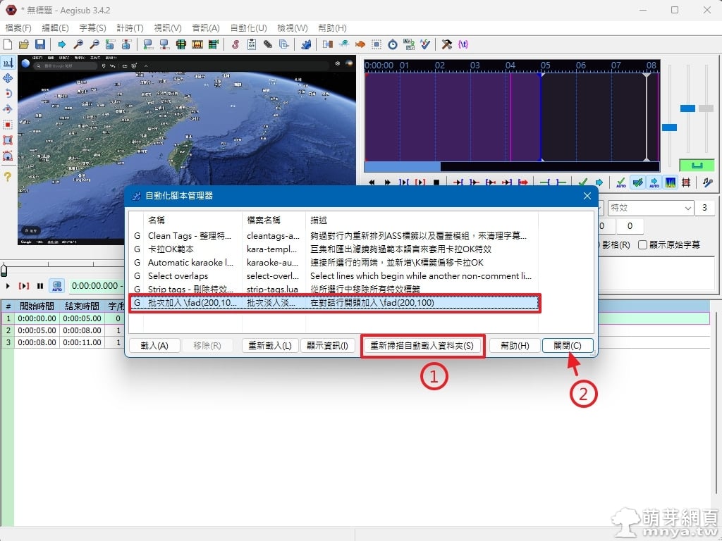 ▲ 回到自動化腳本管理器點擊下方「重新掃描自動載入資料夾」即可看到新加入的腳本顯示在清單中,最後按「關閉」。