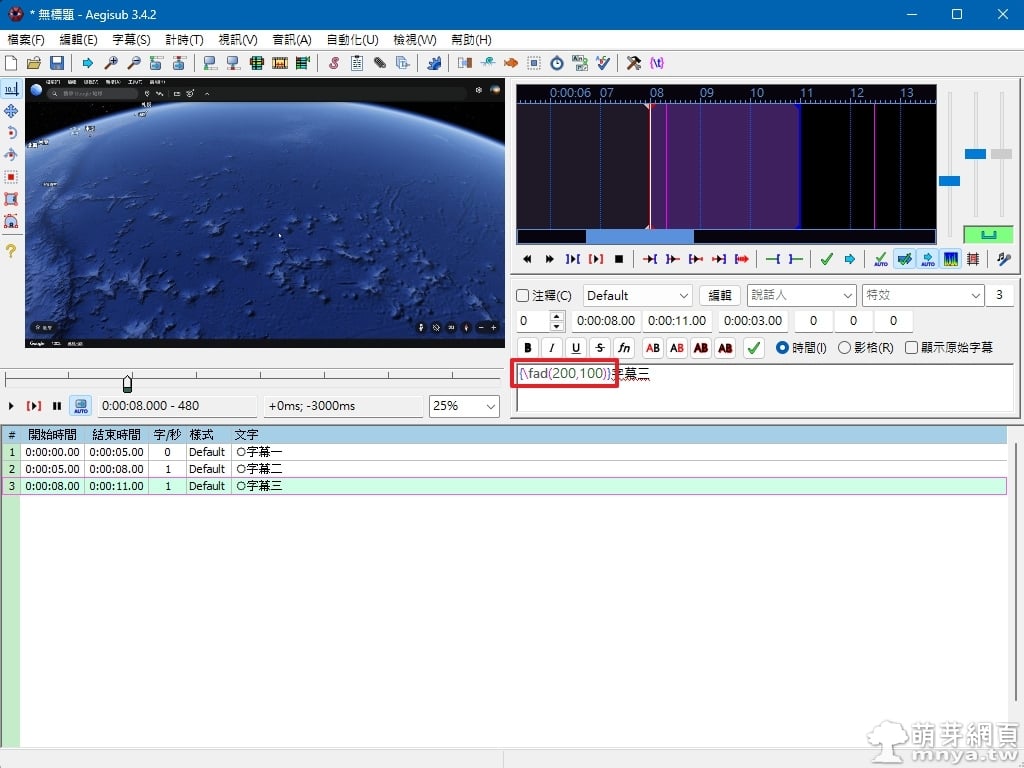 ▲ 套用後會自動在字幕開頭加入 {\fad(200,100)},達成批次淡入淡出的視覺效果。這樣就不需手動一行一行修改了。