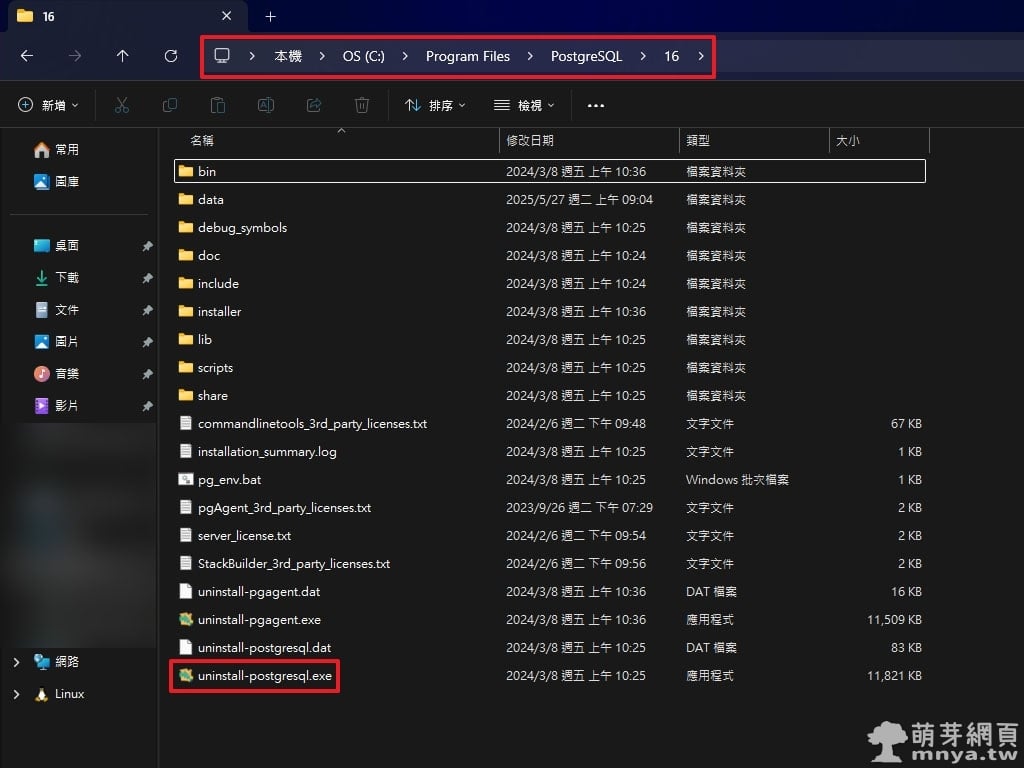 ▲ 開啟安裝路徑 C:\Program Files\PostgreSQL\16\ (預設路徑),找到 uninstall-postgresql.exe 解除安裝程式並執行。