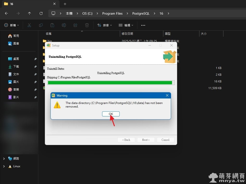 ▲ 系統提示資料目錄未被移除,這是正常現象,點選「OK」繼續。
