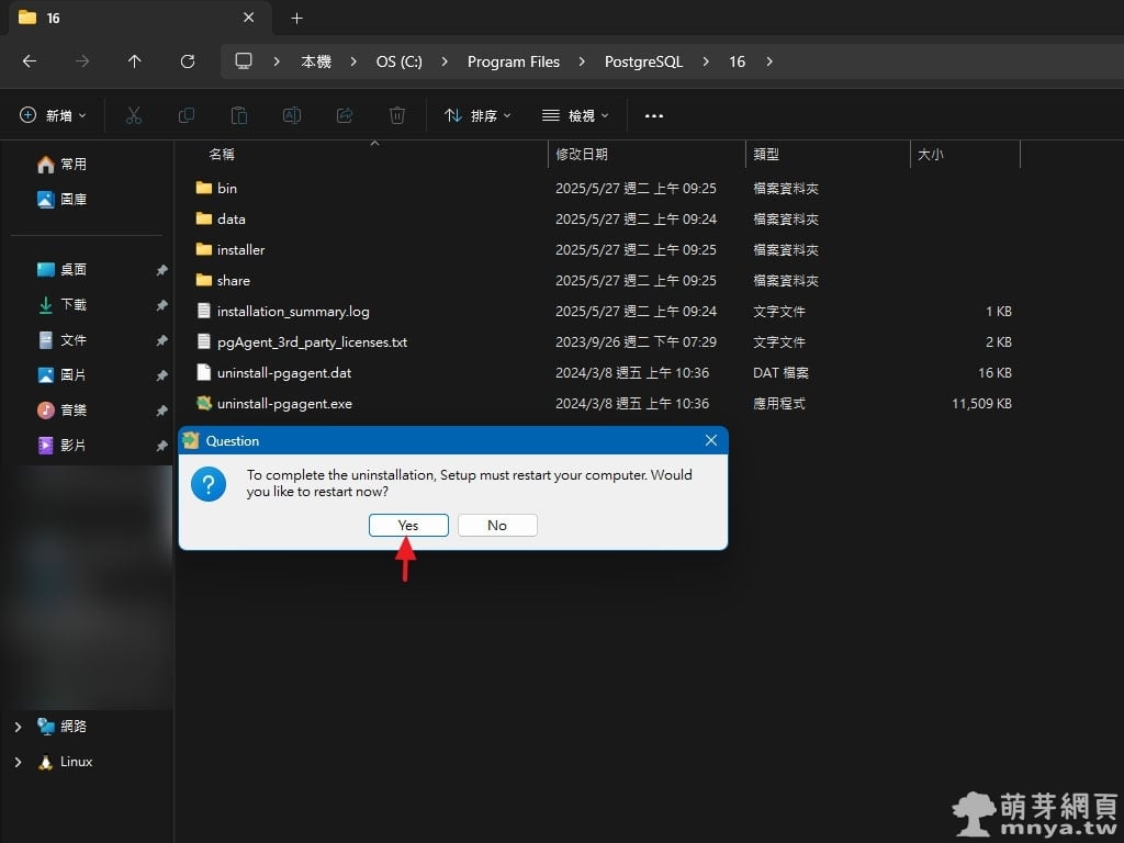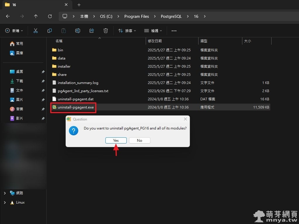 ▲ 若有安裝 pgAgent,記得執行 uninstall-pgagent.exe 並點選「Yes」一併移除。