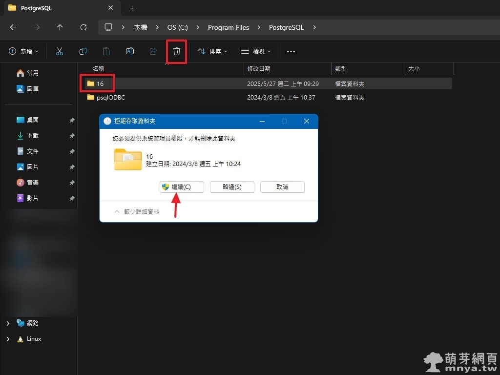 ▲ 最後回到安裝資料夾手動刪除 16 資料夾,系統會請求管理員權限,點選「繼續」完成刪除。