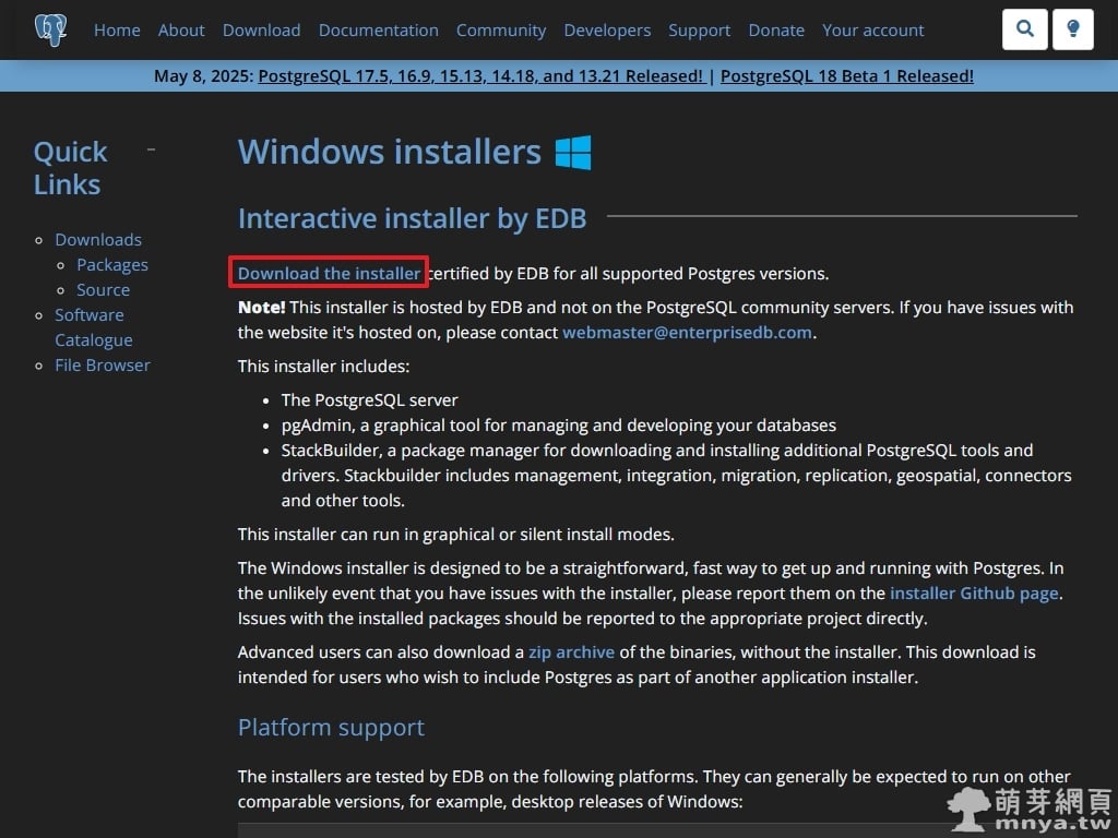 ▲ 進入 PostgreSQL Windows 官方下載頁面後,點選「Download the installer」。