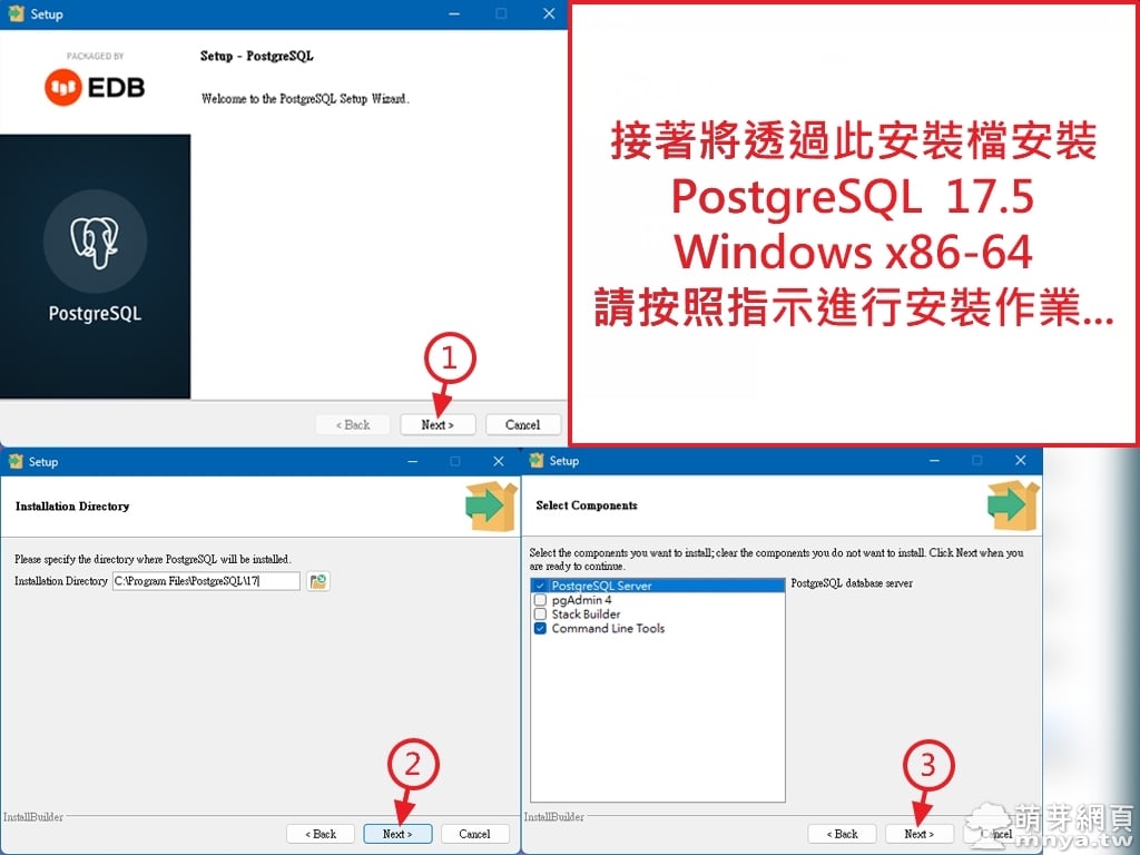 ▲ 啟動安裝程式後,依序點選 Next,選擇安裝路徑與元件,如 PostgreSQL Server。