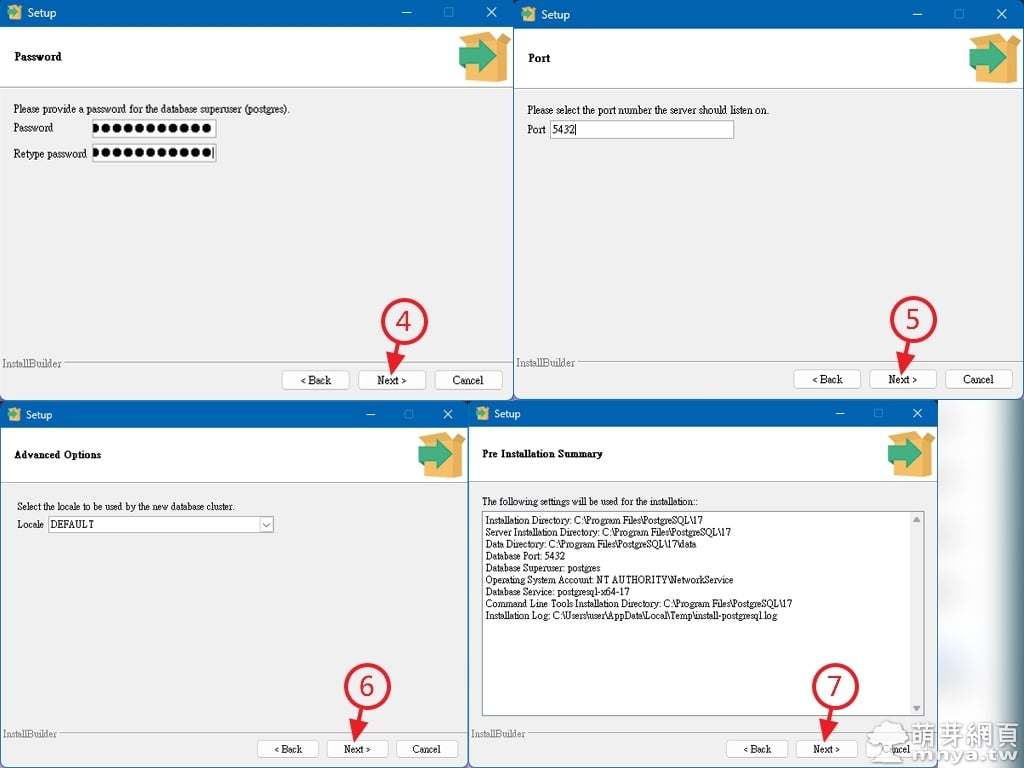 ▲ 設定超級使用者密碼與伺服器使用的埠號(預設 5432),確認安裝摘要後進行安裝。