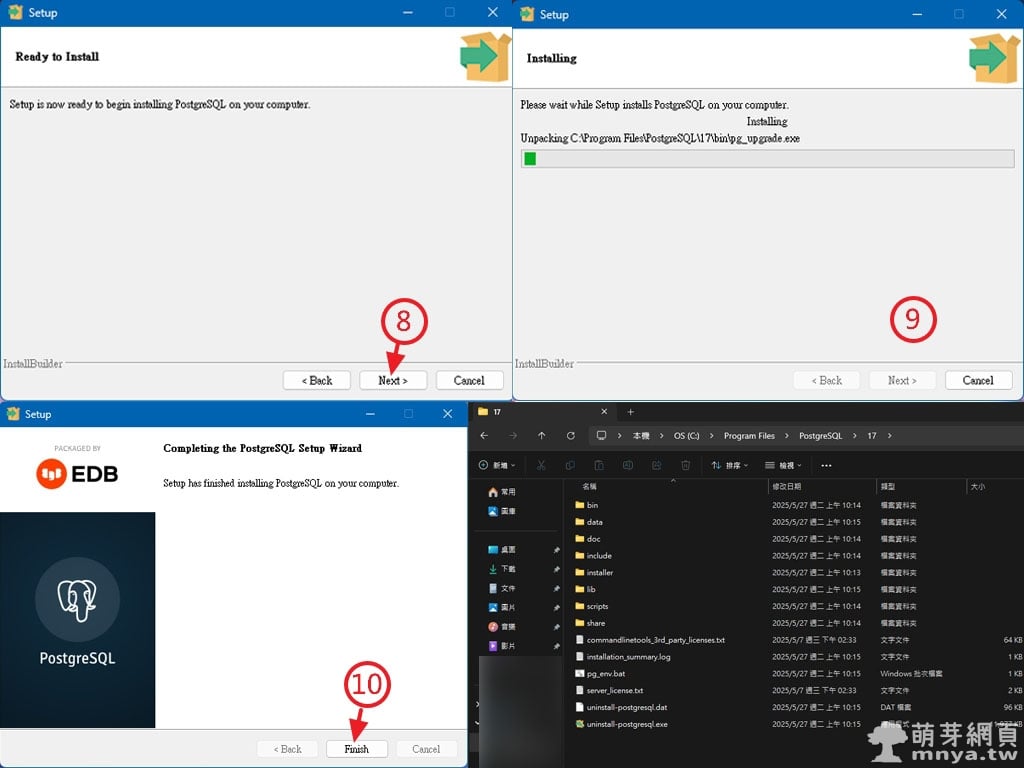 ▲ 安裝過程約需幾分鐘,完成後點選 Finish 即可,PostgreSQL 將出現在預設的安裝目錄中,這邊是 C:\Program Files\PostgreSQL\17。