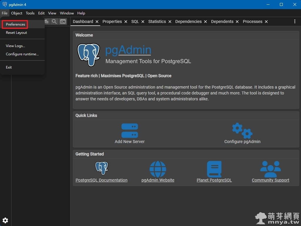 ▲ 開啟 pgAdmin 4 後,點選上方選單「File」,再選「Preferences」以進入偏好設定。