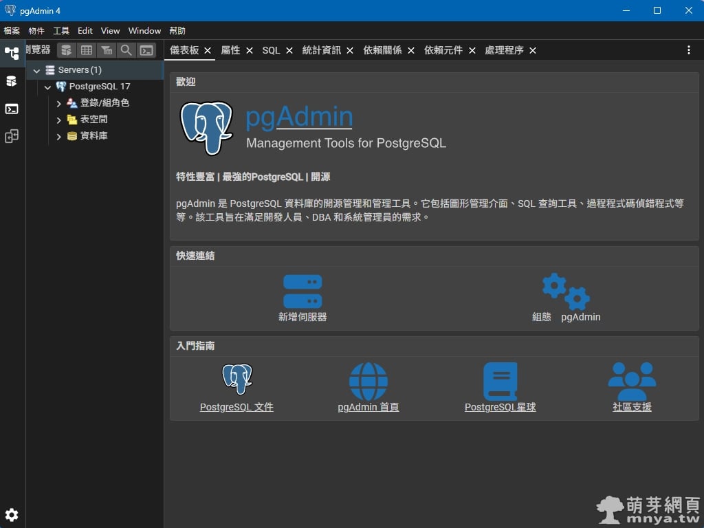 ▲ 完成重新整理後,pgAdmin 4 介面即成功轉換為正體中文,操作項目與選單皆以中文顯示。