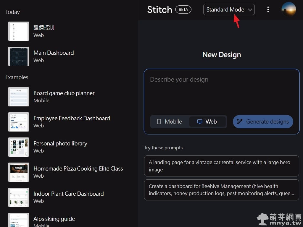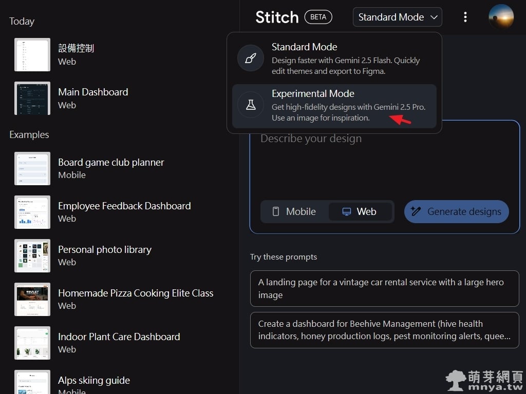 Stitch 提供兩種主要模式:Standard Mode 與 Experimental Mode。Standard Mode 可以更快地編輯主題、細節參數、元件佈局,並能直接生成 Figma 檔案,適合需要自訂與反覆微調設計的需求;Experimental Mode 則能讀取圖片作為靈感,利用更高階的 Gemini 2.5 Pro,產出精緻且視覺風格多變的設計草圖,雖然互動彈性較低,但對於靈感激發或快速產出原型很有幫助。目前這兩種模式皆免費提供使用者體驗。