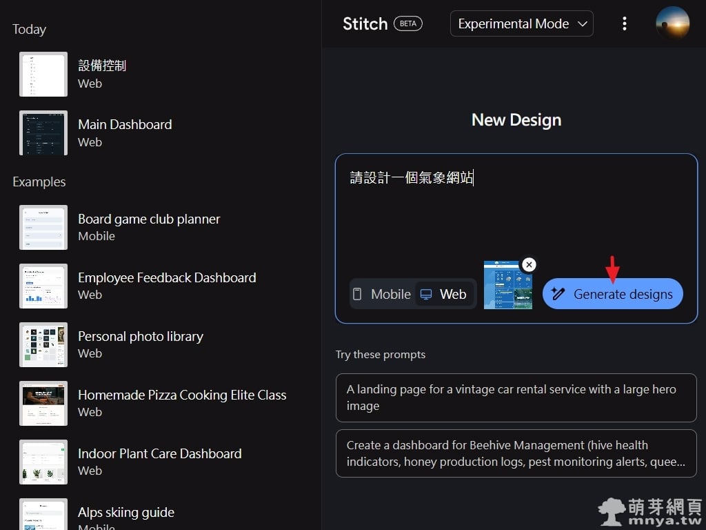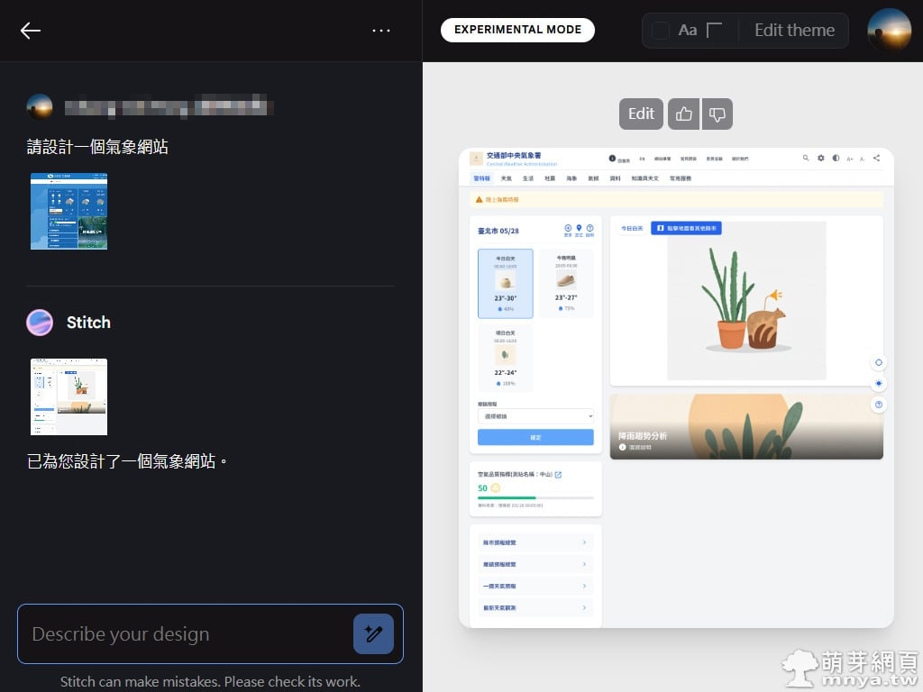 ▲ 我先以 Experimental Mode 上傳中央氣象署的網頁截圖,並輸入設計指令給 AI 參考,生成新版氣象網站草圖。