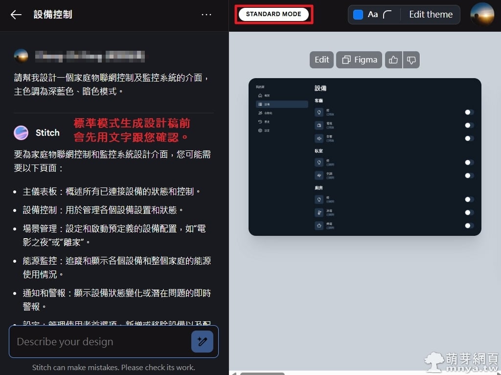 ▲ 我再改用 Standard Mode 設計智慧家庭物聯網控制與監控系統,進入設計前會先產生文字確認稿,回覆確認後就會開始生成。