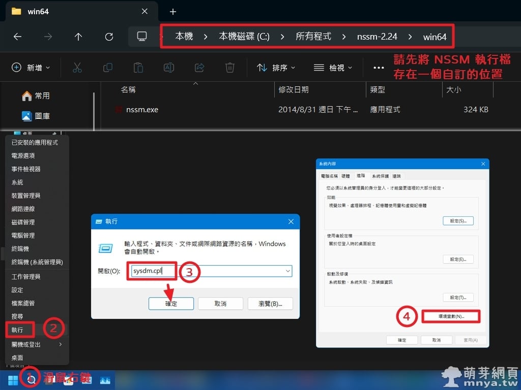 ▲ 首先,請先將 nssm.exe 執行檔放到一個你慣用或容易找到的位置(例如:C:\所有程式\nssm-2.24\win64),這樣之後設定環境變數會更方便。接著滑鼠右鍵點左下開始,接著選「執行」,輸入「sysdm.cpl」後點「確定」,接著切到「進階」並點入「環境變數」。